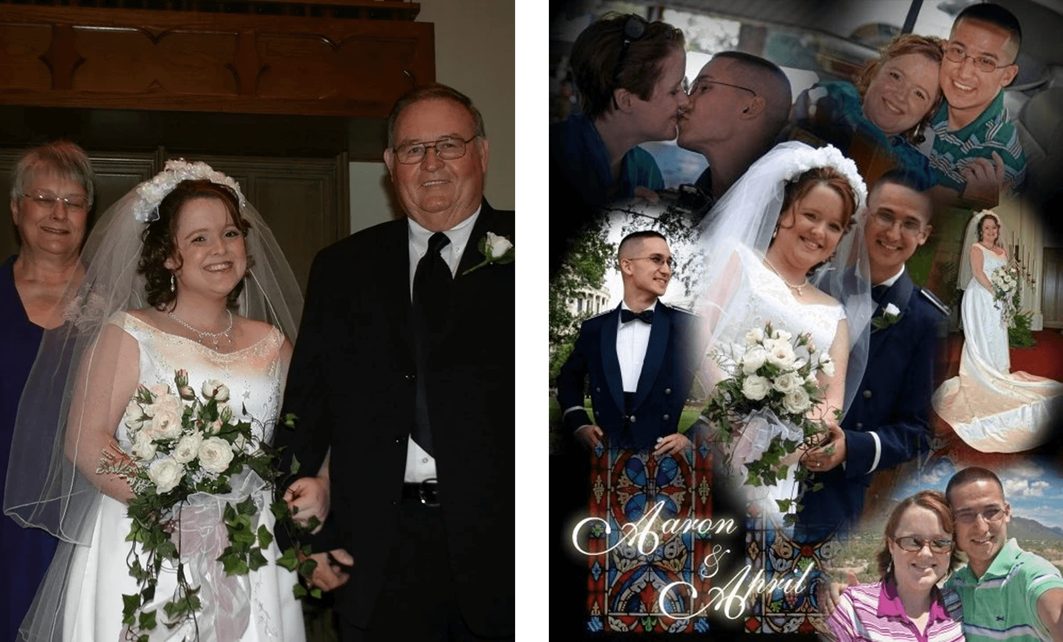 (Pictured Below: Left to Right: April at her wedding with her grandparents; April and her husband, Aaron)